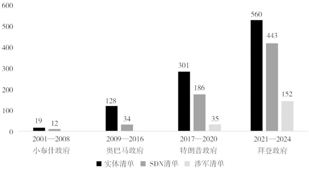 在不同总统任期范围内,本文对各核心清单内的新增实体数量进行了逐年加总,发现早期小布什与奥巴马政府对华制裁的实体数量总和,不及2017—2020年特朗普政府制裁实体数量的一半。此外,拜登政府不仅延续了特朗普政府的对华遏制策略,还通过颁行“小院高墙”封锁战略进一步加大制裁力度。到2024年底,核心清单的制裁数量已被推至前所未有的高点。