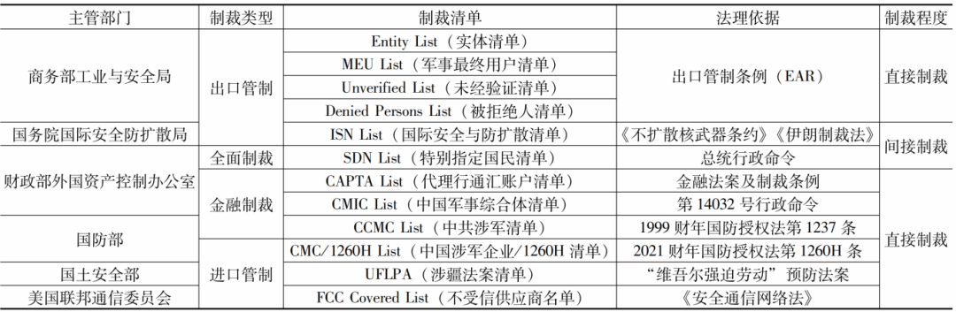 为建立对美国制裁清单的系统性认知,本文通过查阅美国各政府部门官方发布的公开信息,分门别类地对美国制裁清单进行全面整理,并根据法理依据、制裁类型及制裁程度进行总结,最终形成如表1所示的美国对华制裁清单框架。