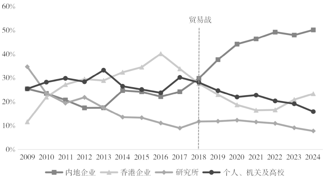 以贸易战为分界线,本文发现,在2018年前,不同类型实体在所有实体中所占的比重较为均衡,表明美国早期对华制裁目标分散,并未呈现出明显偏好;然而在2018年后,制裁清单目标开始集中于内地企业,比重由2018年的31%显著攀升到2024年的52%,和其他类型实体的差距逐渐拉大。