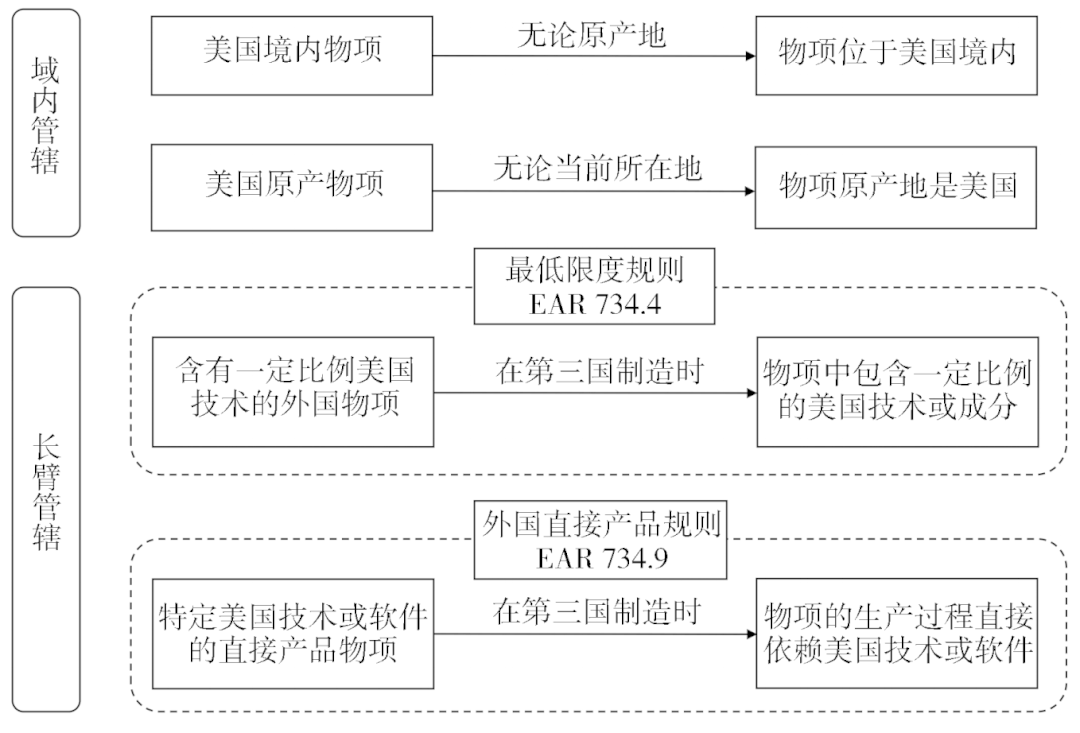 作为出口管制的起点,物项指向所有被纳入EAR管控范围的技术、商品及服务。根据第734.3条受控物项条款、734.4条最低限度规则及734.9条外国直接产品规则,EAR已经构建起一套基于域内管辖与长臂管辖的物项管控体系(图8)。其中,域内管辖要求所有在美国境内或原产于美国的物项,无论物项原产地与当前所在地,均受EAR的管控;长臂管辖则将制裁范围无理拓宽到美国境外,意味着第三国制造的含有一定比例美国技术的产品,或其第三国工厂生产线与主要组件使用特定美国技术的产品,同样需遵循EAR的管控。