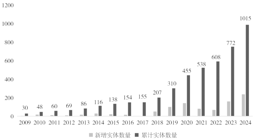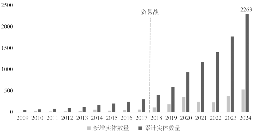 在全球数据中本文聚焦对华制裁情况,发现实体清单呈现出贸易战后制裁升级的阶段性特征。如图5所示,在2009—2017年间,实体清单纳入中国实体的增速较为平缓,仅从2009年的30家增至2017年的155家,表明美国尚未释放全面对华制裁信号。然而从2018年以来,清单内的中国实体数量迅速攀升,从207家迅速增至1015家,与第二阶段的增长数量相比,在更短时间内实现了5倍于基期的增长。