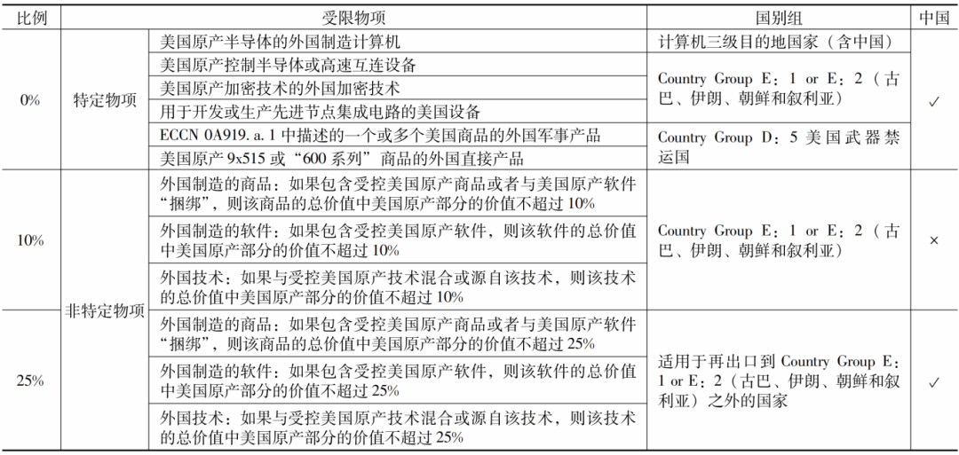 最低限额规则按照关键领域的物项分类,将外国物项中所含美国原产技术和产品的比例划分为0%、10%和25%三档,分别对应不同的管控强度和国别范围。