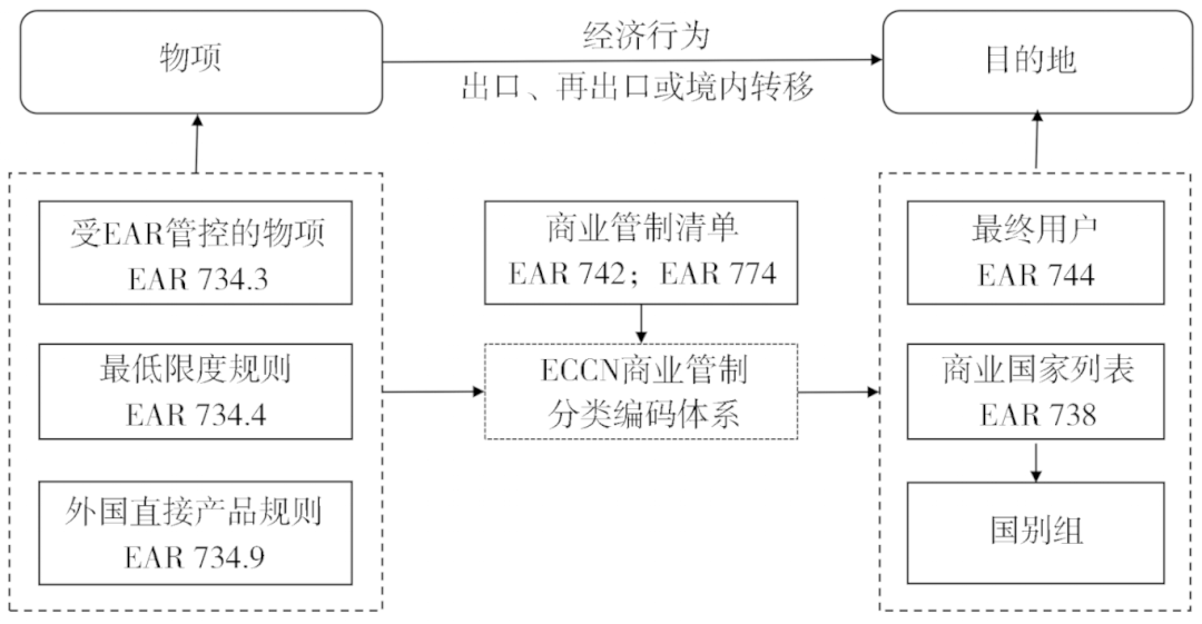 物项与目的地的衔接,在实务层面体现为出口、再出口与物项转移的经济活动,而在EAR体系内则体现为对物项产品与最终国别组的定义。在EAR第742条及744条中,商业管制清单作为具体受控产品的查询工具,主要通过设置ECCN分类编码的方式为受控物项分配特定编码,进而汇总得出不同目的地国家对应的产品—国别列表。