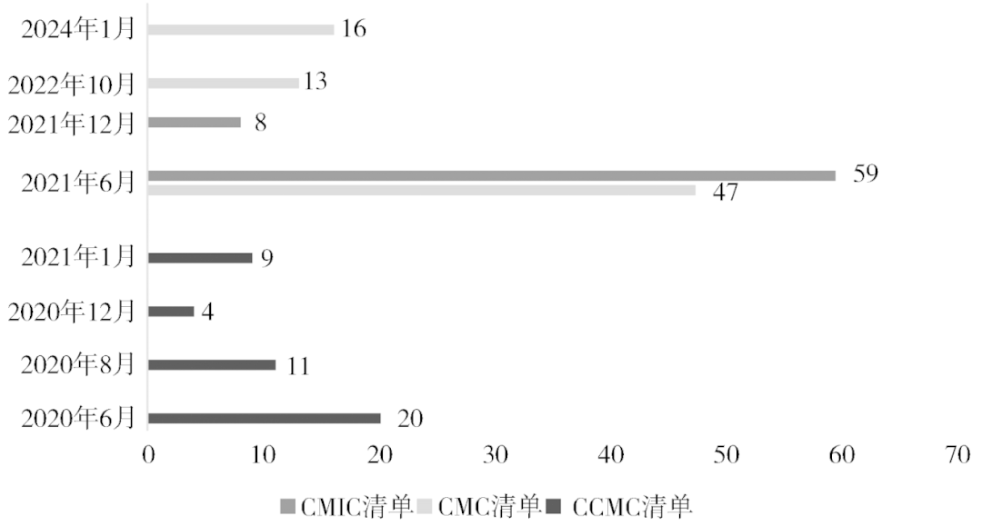 涉军清单是美国专门针对中国涉军企业实施制裁的清单集合,包括国防部管理的CCMC清单与CMC清单,以及财政部OFAC管理的CMIC清单。与实体清单和SDN清单相比,涉军清单在制裁逻辑上具有独特性,主要表现为非连续的制裁时点以及大量交叉制裁的特征。