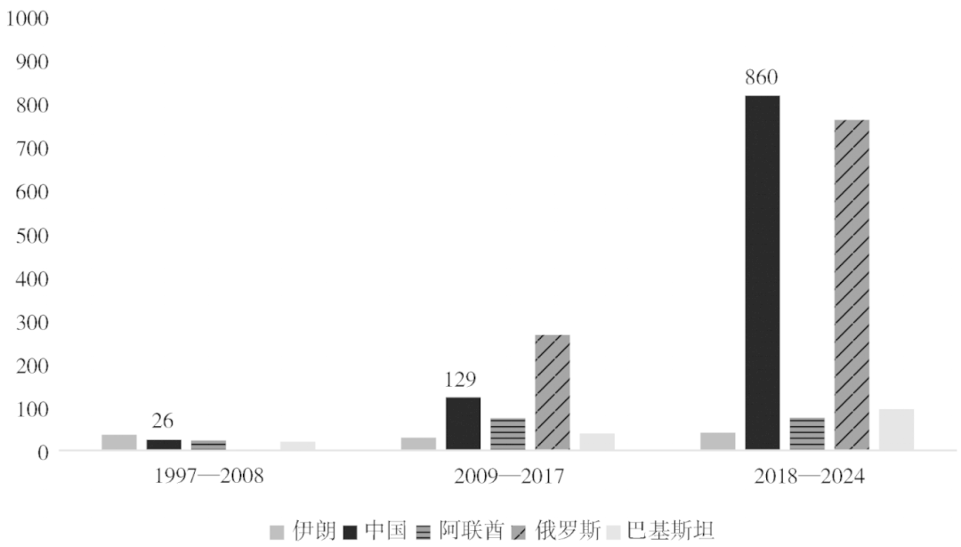 然而,在2018—2024年期间,实体清单对华制裁数量达到前所未有的峰值。自2018年中美贸易战爆发以来,实体清单逐渐发展为美国具有技术封锁目的和对华制裁导向的出口管制策略。从阶段性增量来看,在第三阶段中,被制裁的中国实体数量高达860家,已成为近年美国的核心制裁对象;从总量来看,截至2024年12月,被制裁的中国实体总量高达1015家。按照现有增长率计算,中国即将超过俄罗斯,成为实体清单内被制裁数量最多的国家。