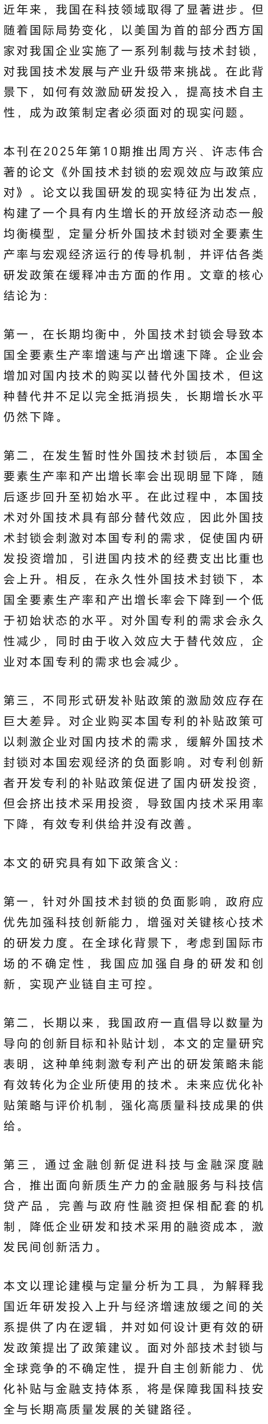 近日,复旦大学经济学院许志伟教授与复旦大学经济学院博士后周方兴合著的论文《外国技术封锁的宏观效应与政策应对》在《世界经济》2025年第10期正式发表。