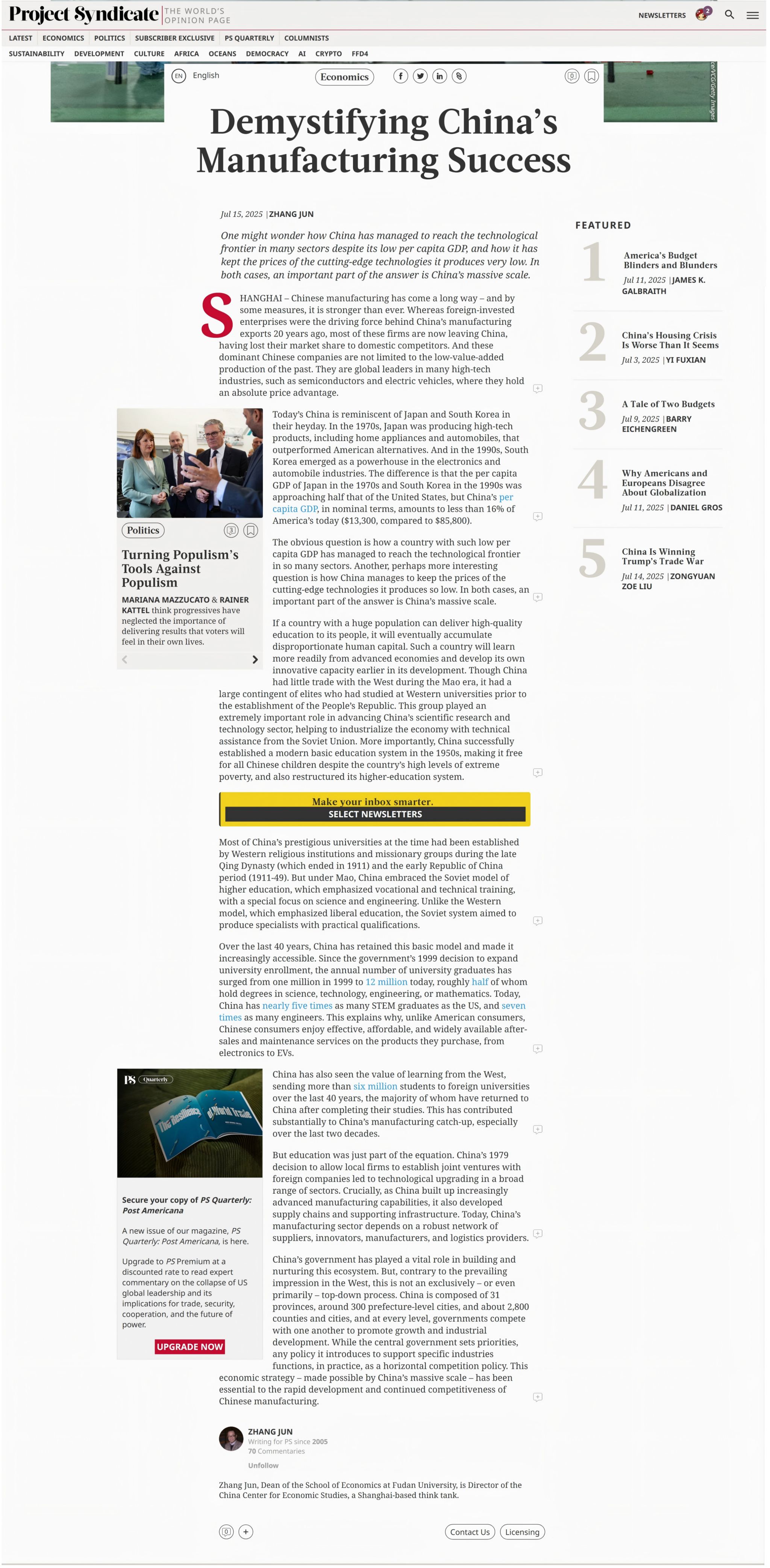 7月15日,复旦大学文科资深教授、经济学院院长、中国经济研究中心主任张军教授在 Project Syndicate 发表深度分析文章Demystifying China’s Manufacturing Success。全文发表于 Project Syndicate,我们推送中文翻译版,并转发英文原文,以飨读者。