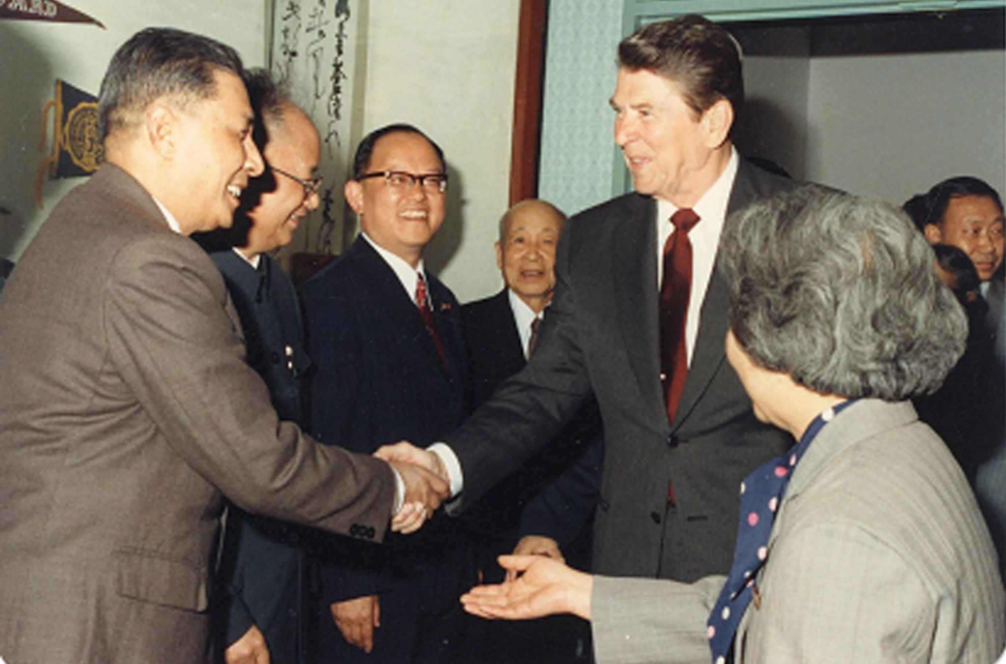 1984年4月30日,美国总统里根访问我校时会见苏步青、谢希德、谭其骧、华中一、蒋学模等教授,右图为经济学系蒋学模教授(左一)与里根总统握手。
